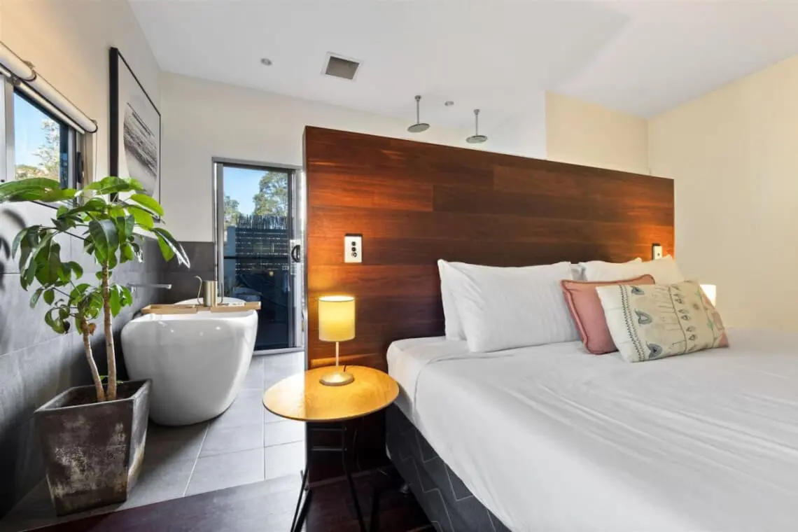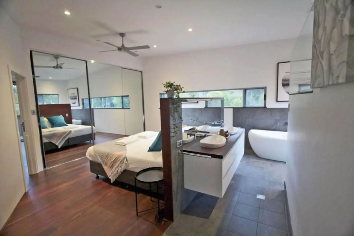 The property has an ensuite bathroom featuring an egg-shaped tub, walk-in shower, toilet, and outdoor seating area. The second bathroom also includes a walk-in shower and toilet, with 24/7 hot water available.