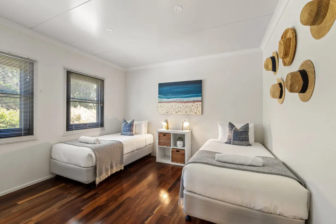 Bedrooms 1 and 2 each feature a queen bed, while Bedroom 3 includes two single beds. We supply high-quality linen and fresh towels for all guests.