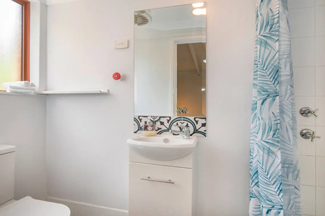 The property has two bathrooms. Bedroom 1 includes an ensuite with a walk-in shower, bathtub, and toilet. The second bathroom is shared and features a shower and toilet, with 24/7 hot water available.