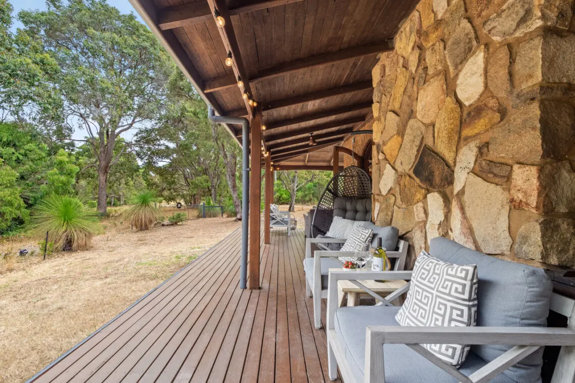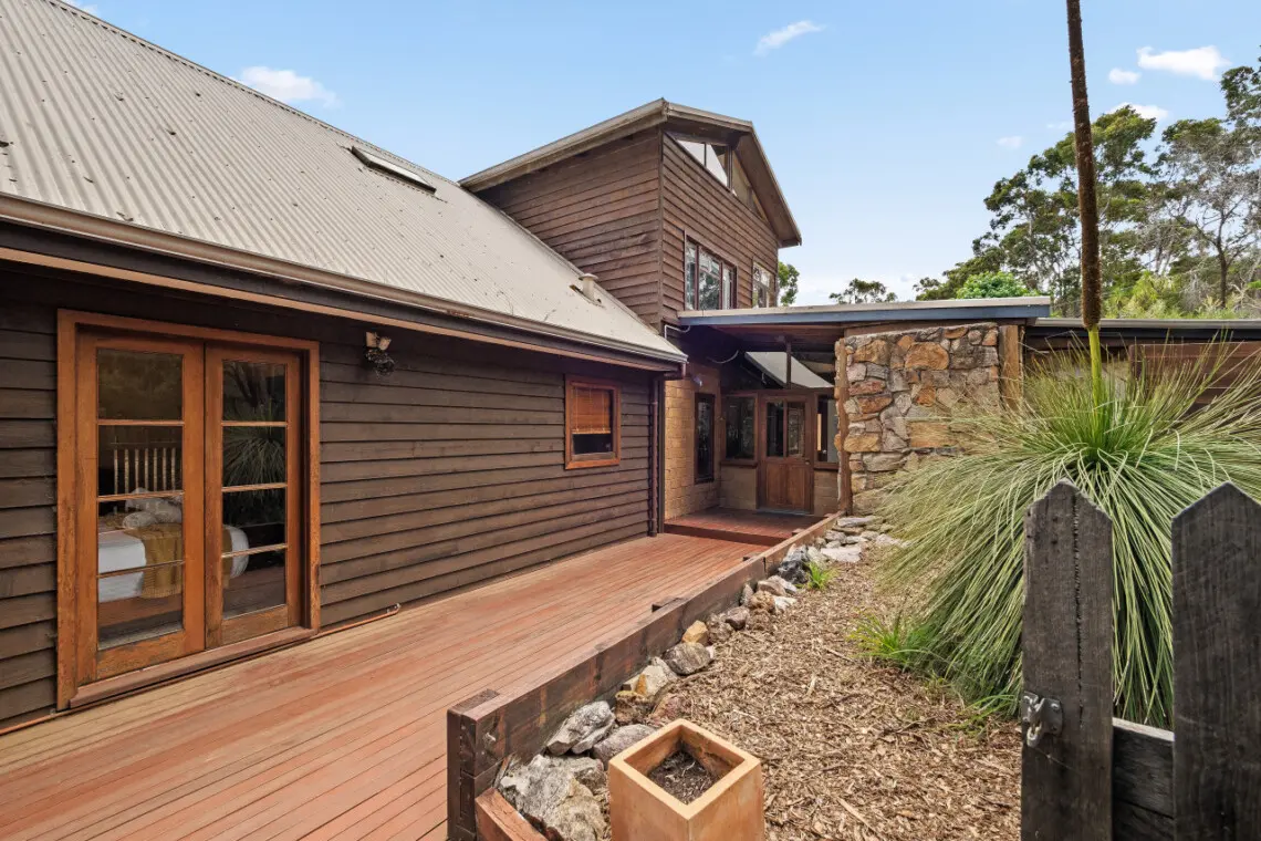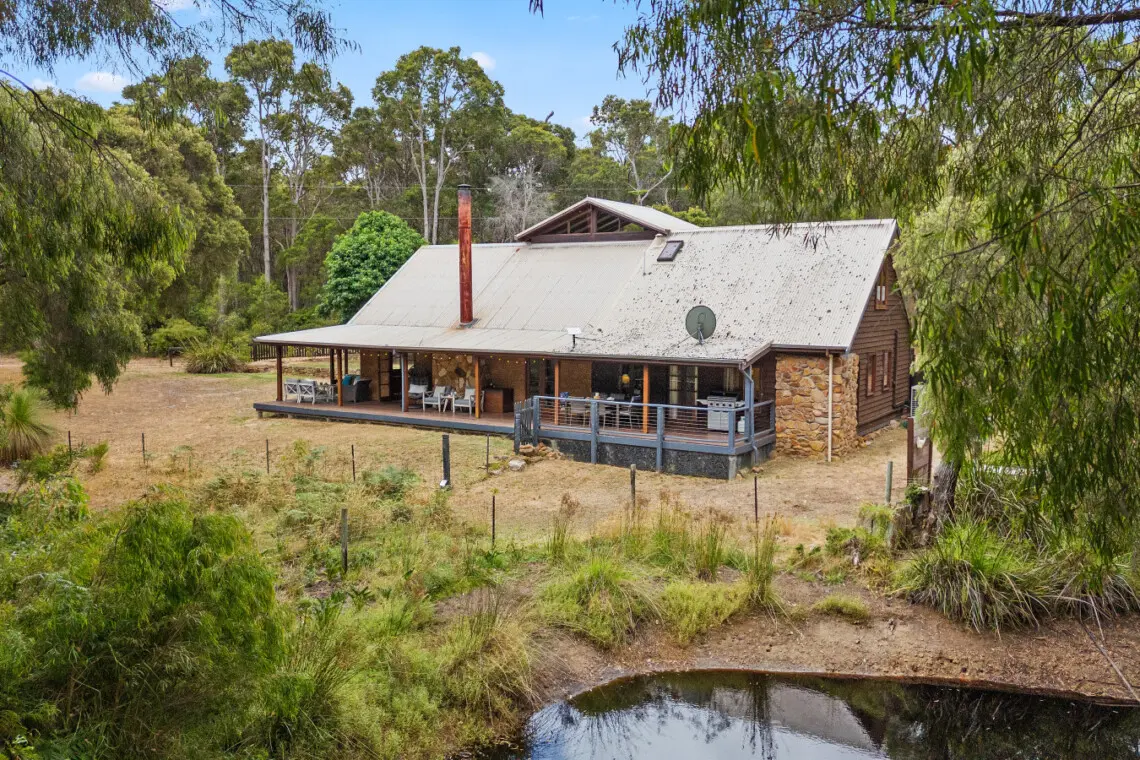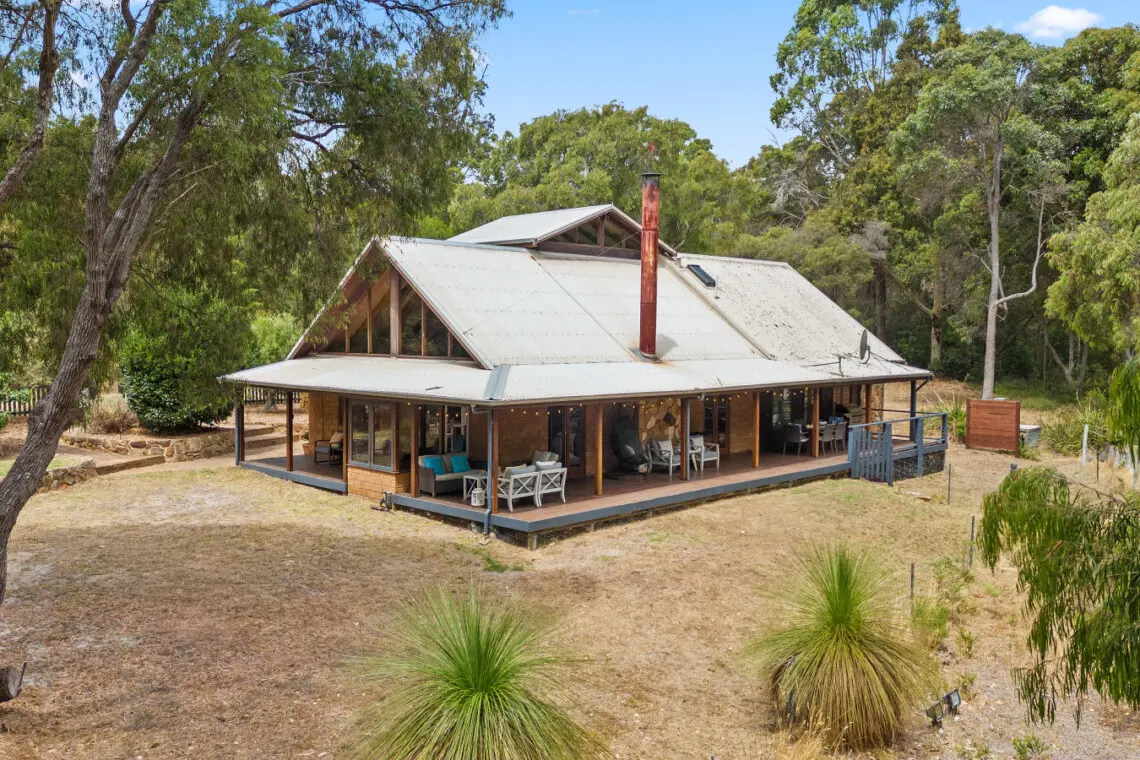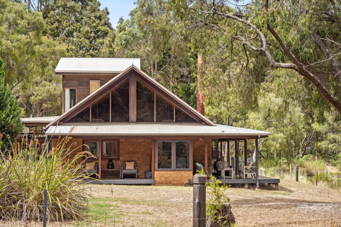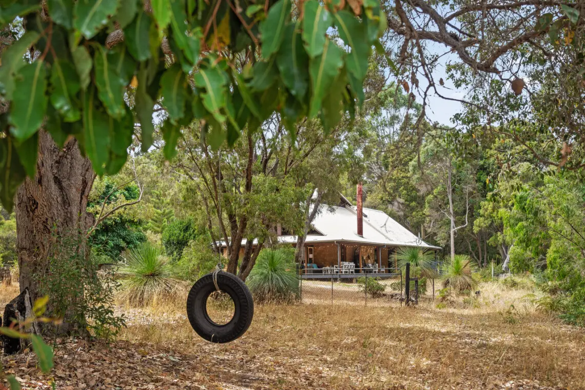 Blending rustic charm with modern comfort, the mud brick and jarrah home features four bedrooms, three bathrooms, and open plan living. Relax on the wide verandah and watch the local wildlife or cosy up indoors by the open fireplace.
