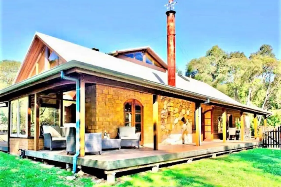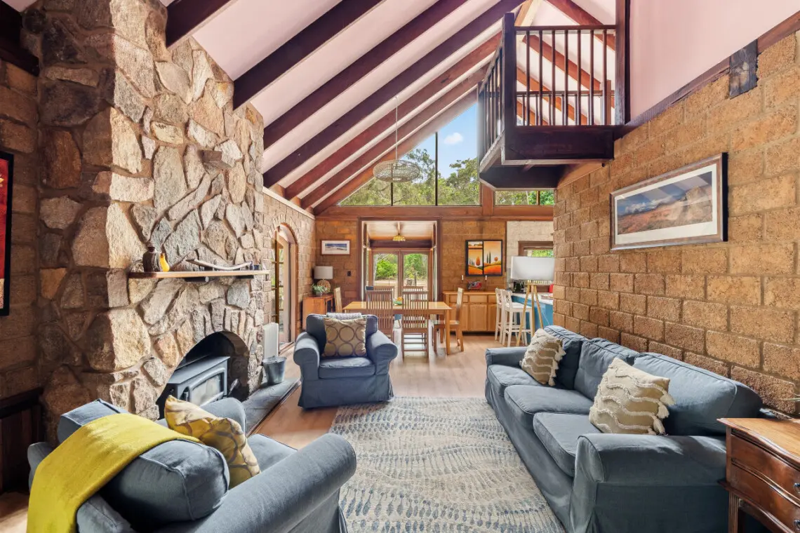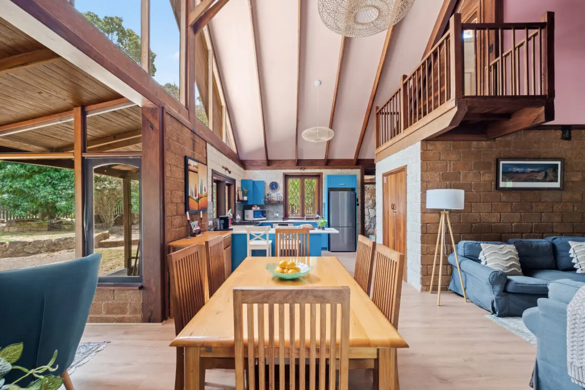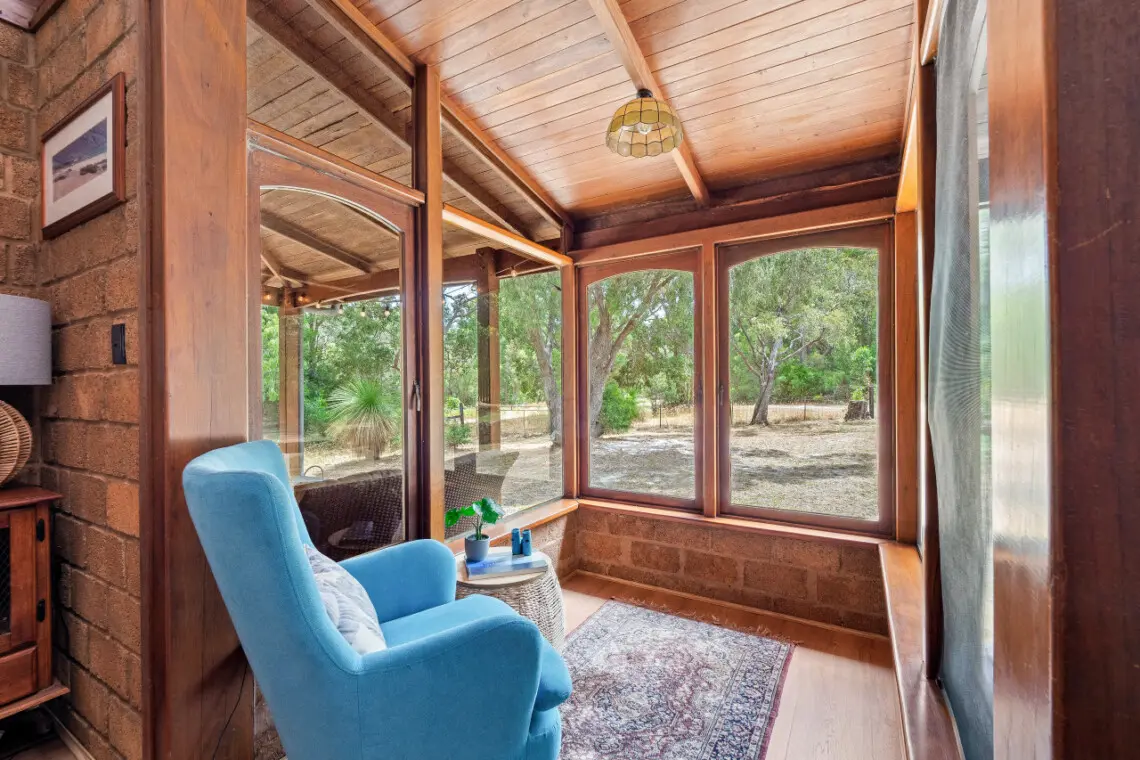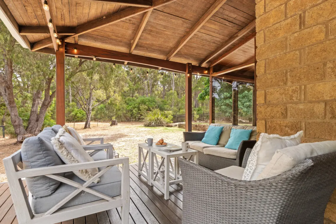 Blending rustic charm with modern comfort, the mud brick and jarrah home features four bedrooms, three bathrooms, and open plan living. Relax on the wide verandah and watch the local wildlife or cosy up indoors by the open fireplace.