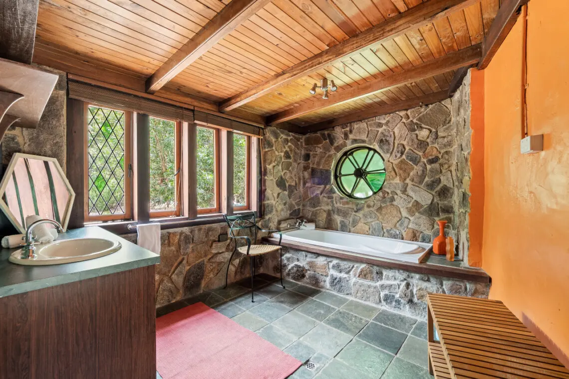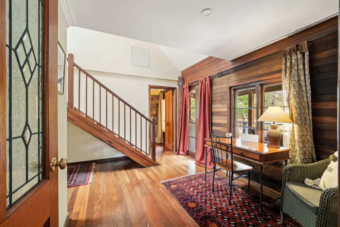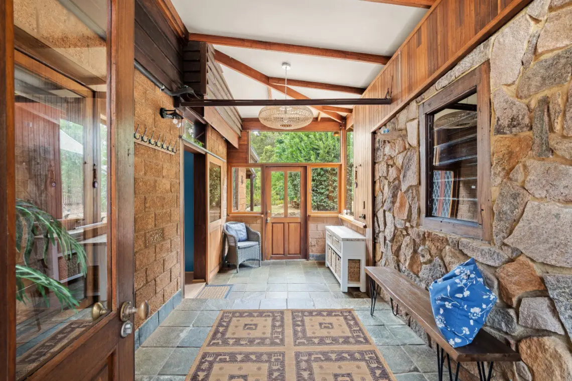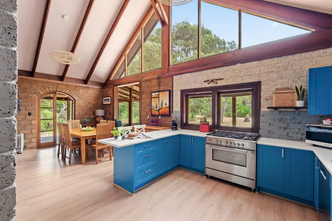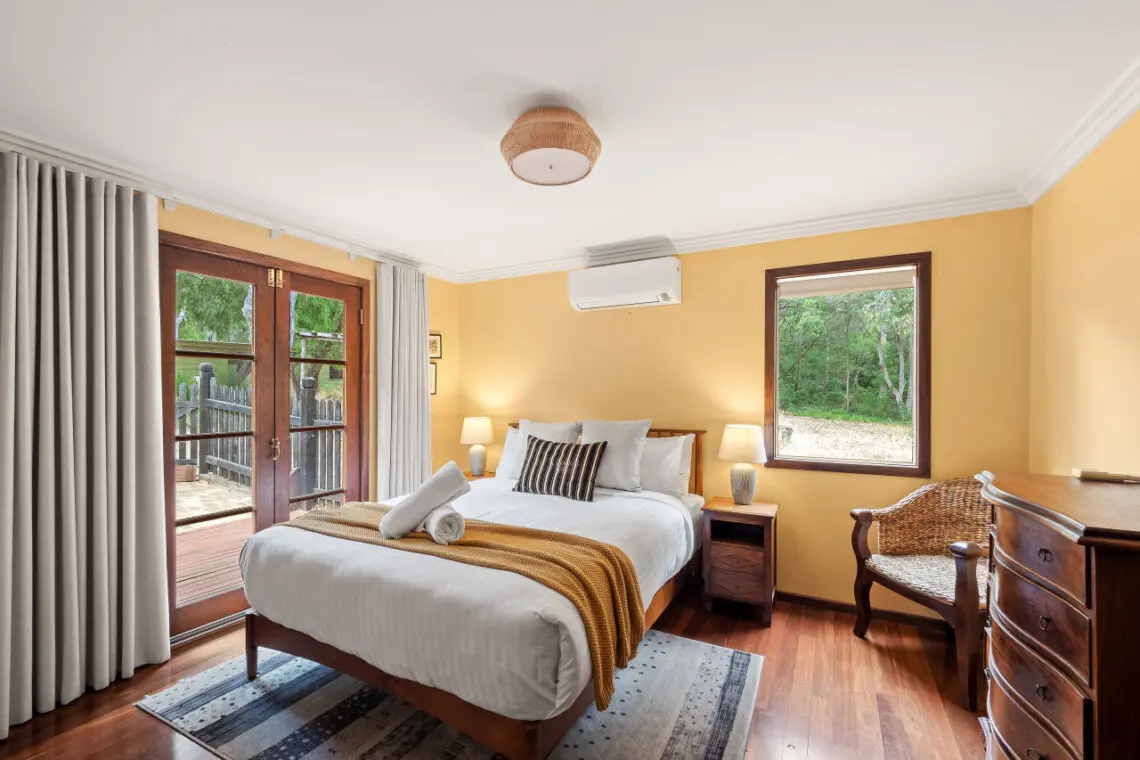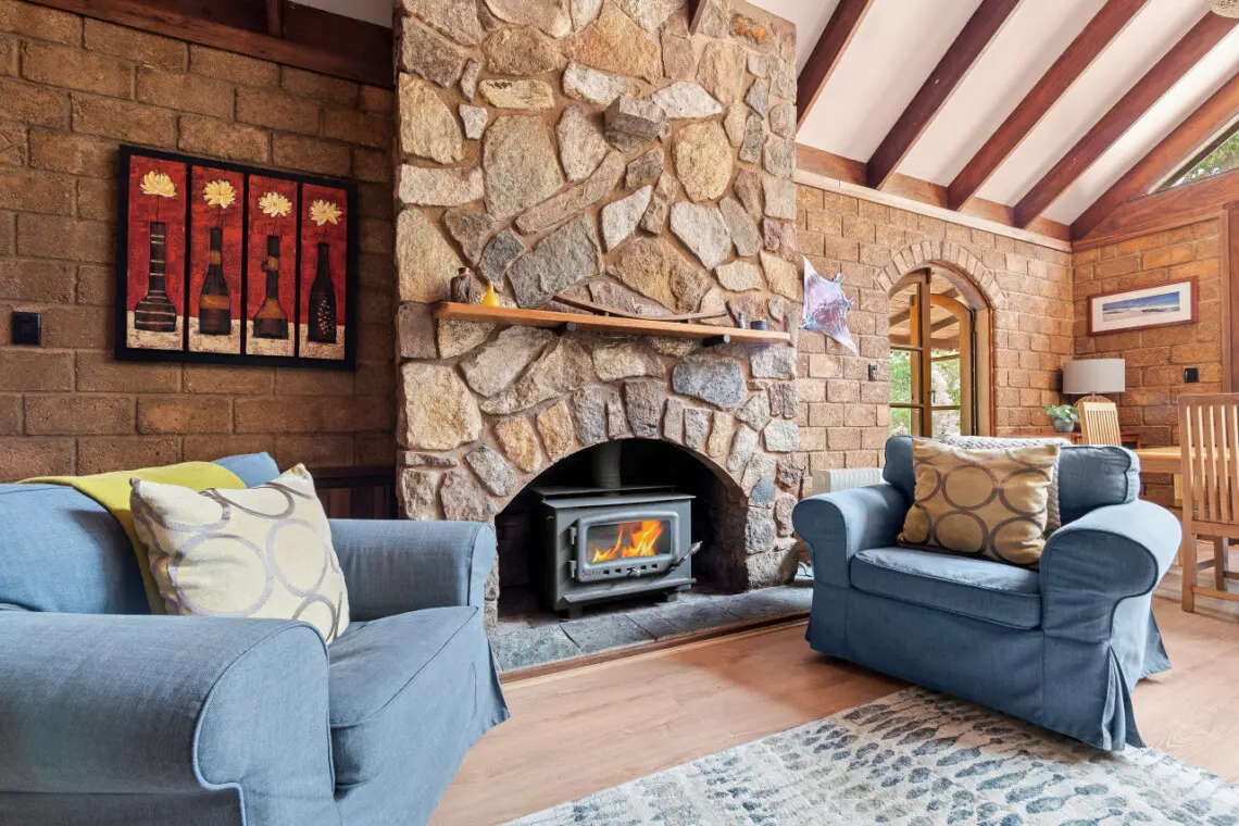 Blending rustic charm with modern comfort, the mud brick and jarrah home features four bedrooms, three bathrooms, and open plan living. Relax on the wide verandah and watch the local wildlife or cosy up indoors by the open fireplace.